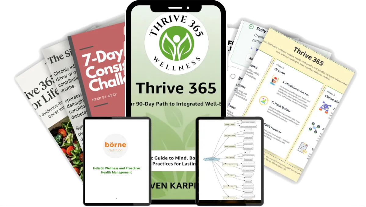 A complete system for immunity, anti-inflammation and healthy living, including a detailed 9-step "Thrive 365 Challenge 7 Action Framework."